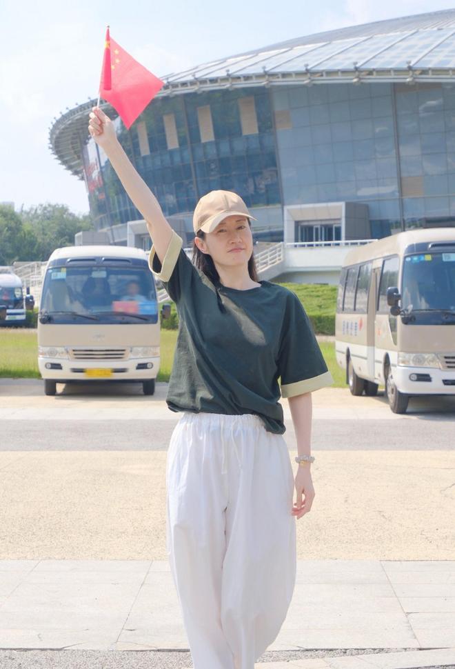 看得出,刘敏涛非常骄傲,一只手拿着国旗举得高高的,另一只手放在身边,嘴巴抿得紧紧的,眼睛里充满了笑意。