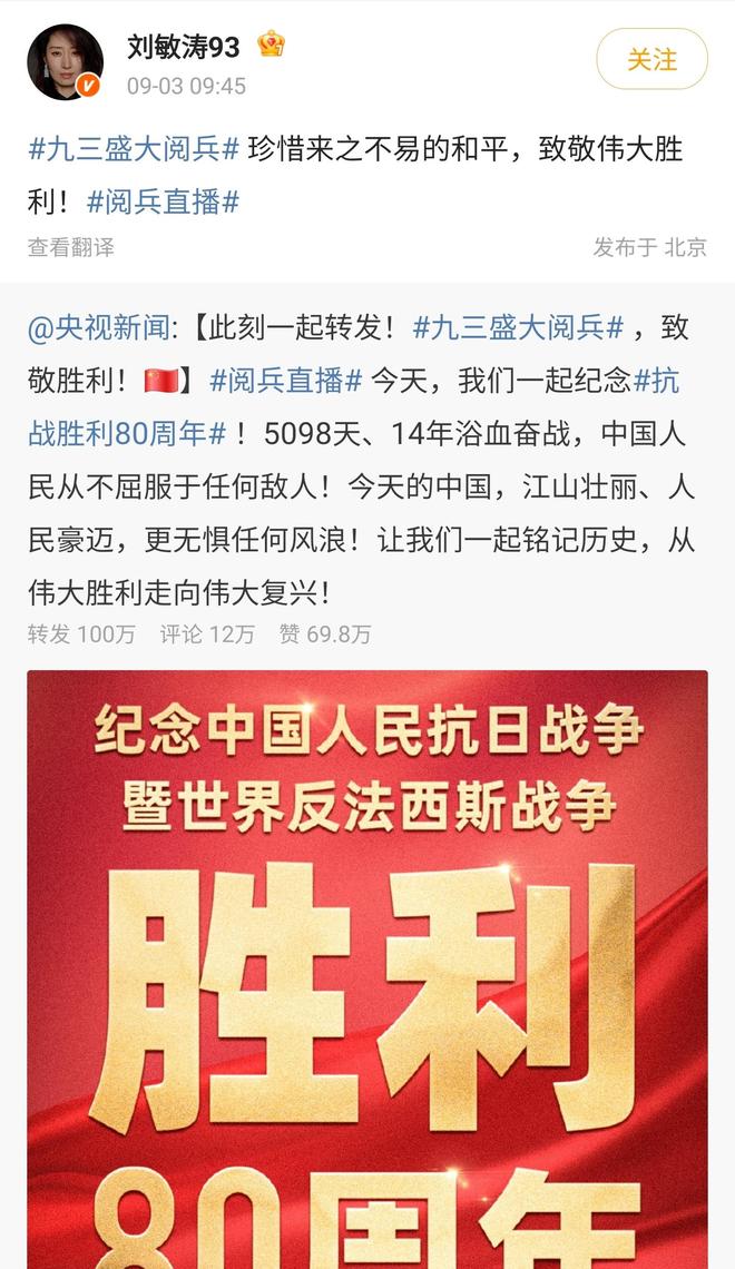 beat365内容是她参加纪念中国人民抗日战争暨世界反法西斯战争胜利80周年文艺晚会后的。